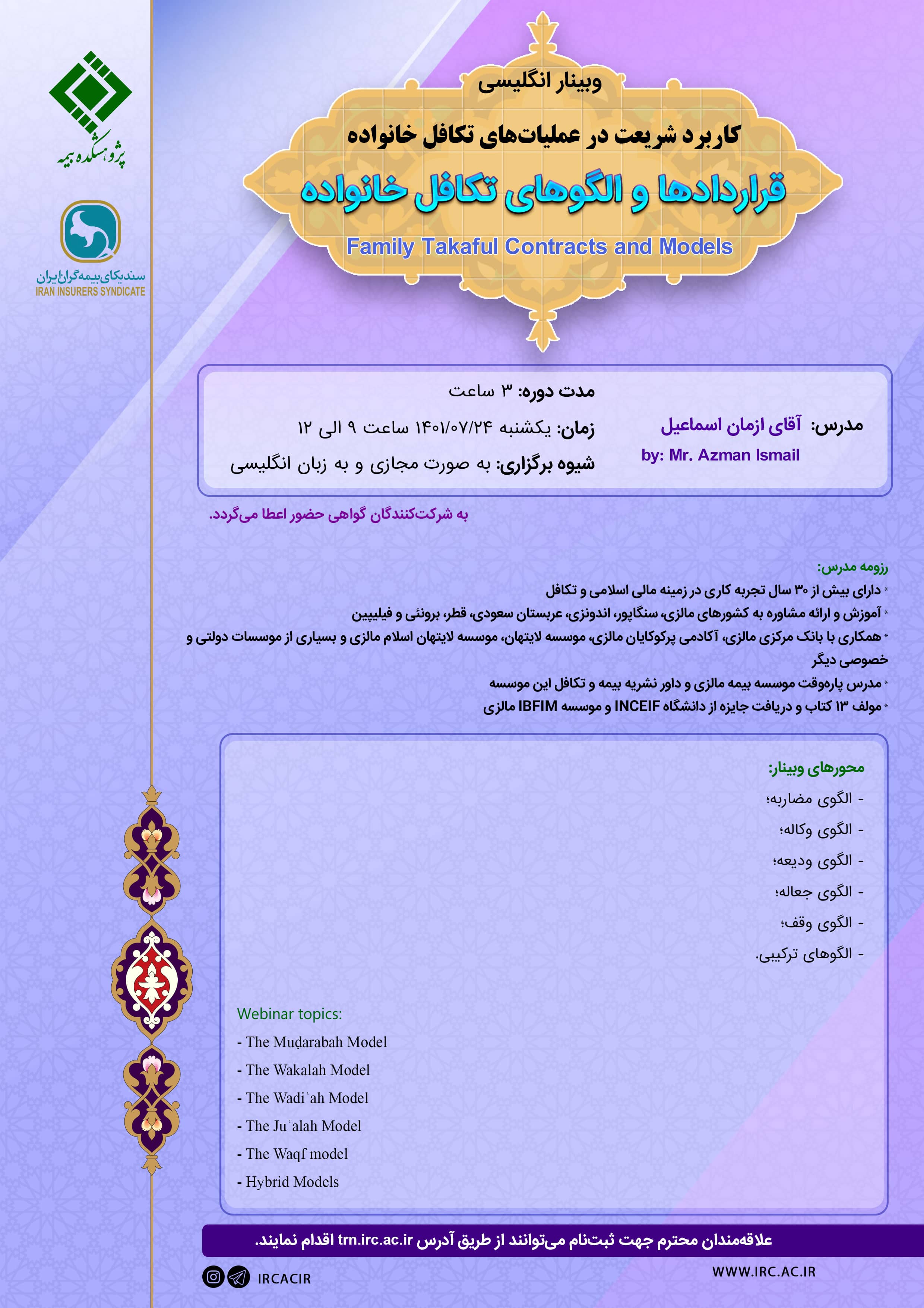 وبینار دوره آموزشی «کاربرد شریعت در عملیاتهای تکافل خانواده» با موضوع «قراردادها و الگوهای تکافل خانواده»