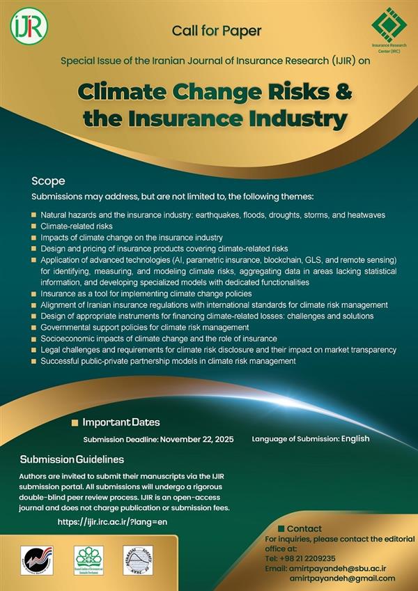 The Iranian Journal of Insurance Research (IJIR)—a Grade A, peer-reviewed quarterly journal published by the Insurance Research Center (IRC)—invites original research papers for a special issue dedicated to Climate Change and Insurance. This issue aims to explore the intersection of climate risk and insurance innovation, offering a platform for scholars, practitioners, and policymakers to contribute to the evolving discourse on climate resilience through insurance mechanisms.
