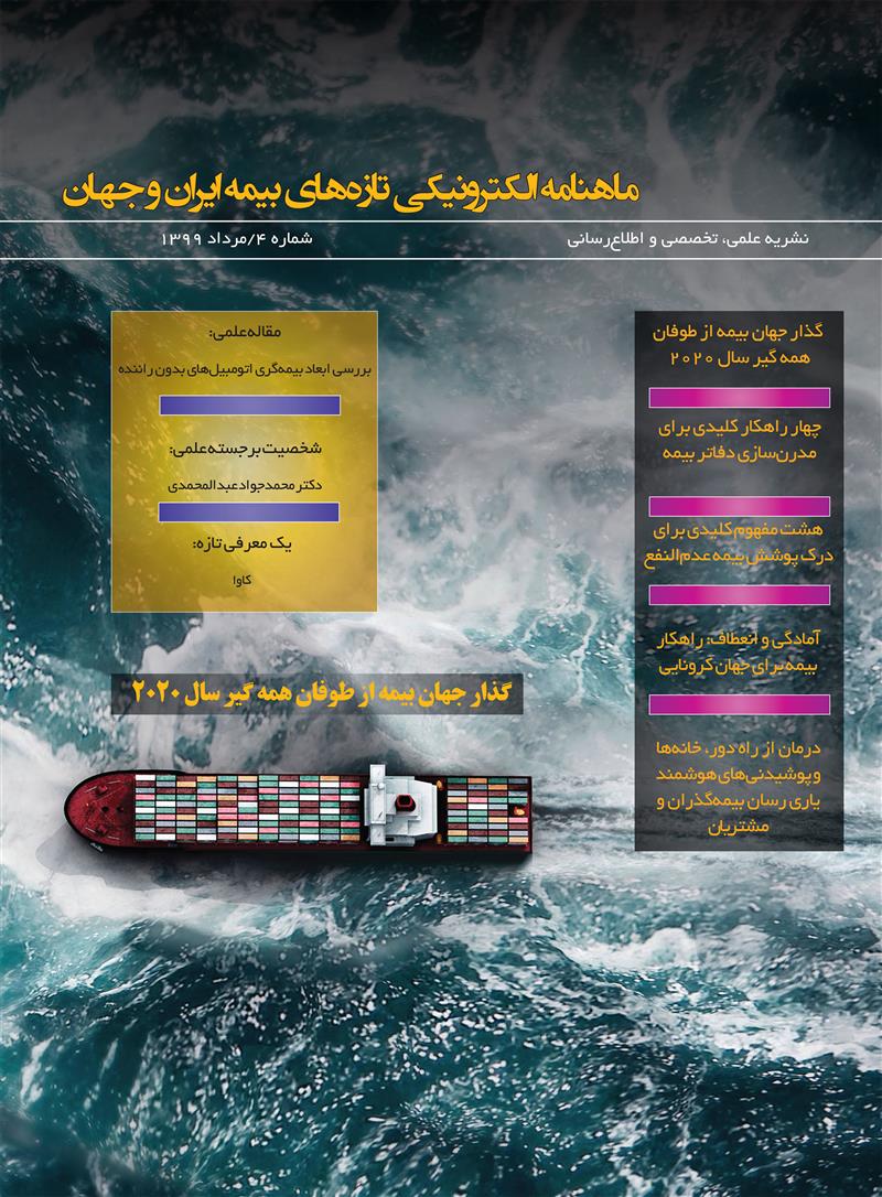 PDF 8/26/2020 item visited : 1567 ماهنامه الكترونیكی تازههای بیمه ایران و جهان شماره 4 بیمه مرداد 1399 فهرست مطالب 1- چهار کلید برای مدرن سازی نمایندگی بیمه 2- گذار جهان بیمه از طوفان همه گیر سال 2020 3- هشت مفهوم کلیدی برای درک پوشش بیمه عدمالنفع 4- آمادگی و انعطاف: راهکار بیمه برای جهان کرونایی 5- درمان از راه دور، خانه ها و پوشیدنی های هوشمند یاری رسان بیمهگران و مشتریان مقاله علمی شخصیت برجسته علمی یک معرفی تازه Average :  3.83 |  Submitted :  6 Tags