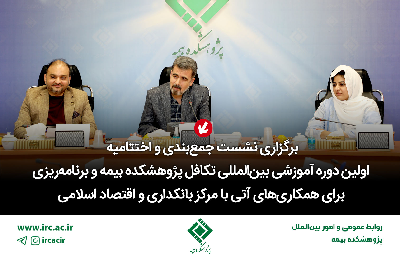 اولین دوره آموزشی بین‌المللی تکافل پژوهشکده بیمه، با برگزاری نشست جمع‌بندی و تبادل نظر برای همکاری‌های آتی با مرکز بانکداری و اقتصاد اسلامی با حضور رئیس پژوهشکده بیمه و مدرسان این دوره در محل پژوهشکده بیمه پایان یافت.