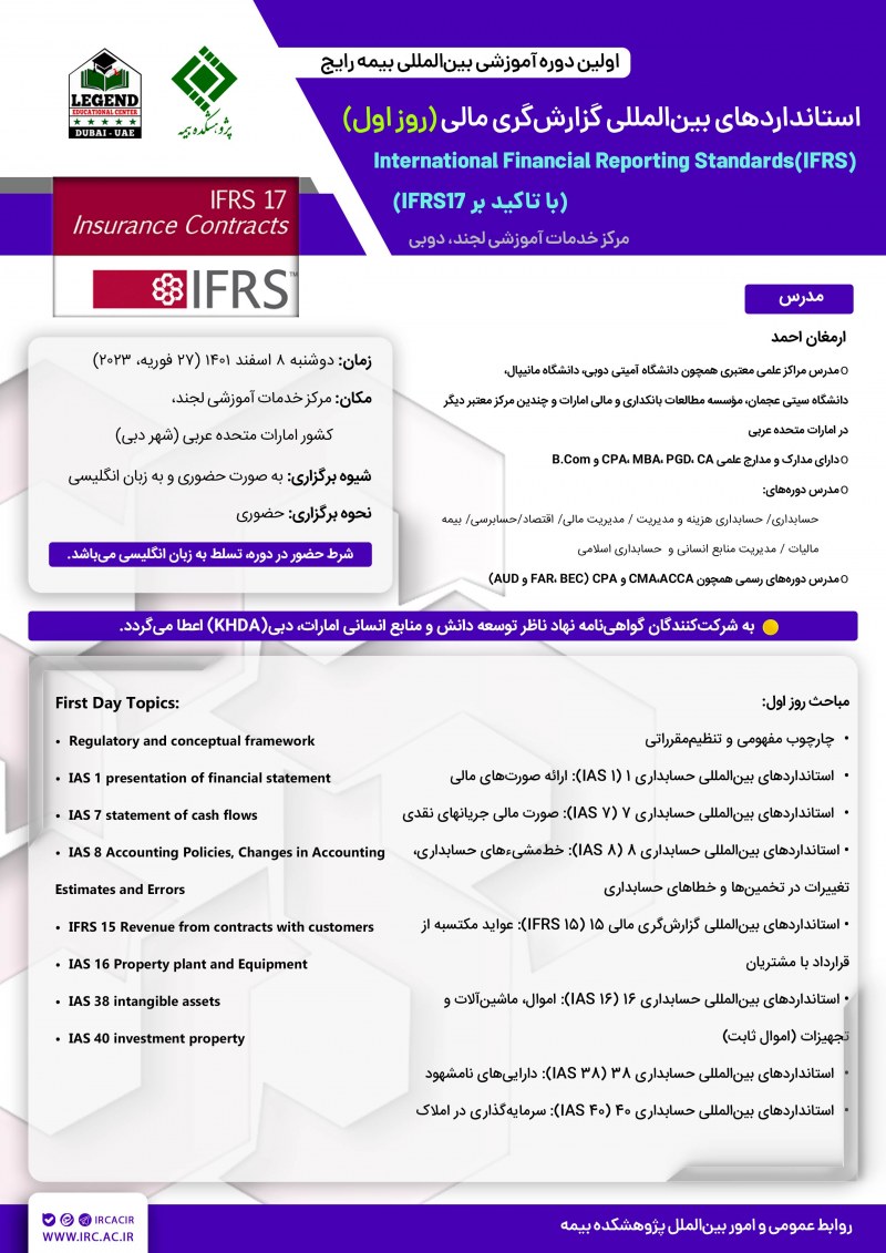در روز دوشنبه ۸ اسفند ۱۴۰۱ (۲۷ فوریه، ۲۰۲۳) و اولین روز از برگزاری این دوره آموزشی، چارچوب مفهومی و تنظیممقرراتی؛ استانداردهای بینالمللی حسابداری ۱ (IAS 1): ارائه صورتهای مالی؛ استانداردهای بینالمللی حسابداری ۷ (IAS 7): صورت مالی جریانهای نقدی؛ استانداردهای بینالمللی حسابداری ۸ (IAS 8): خطمشیهای حسابداری، تغییرات در تخمینها و خطاهای حسابداری؛ بینالمللی گزارشگری مالی 15 (IFRS 15): عواید مکتسبه از قرارداد با مشتریان؛ استانداردهای بینالمللی حسابداری 16 (IAS 16): اموال، ماشینآلات و تجهیزات (اموال ثابت)؛ استانداردهای بینالمللی حسابداری ۳۸ (IAS 38): داراییهای نامشهود؛ و استانداردهای بینالمللی حسابداری ۴۰ (IAS 40): سرمایهگذاری در املاک، توسط ارمغان احمد تدریس خواهد شد و به کلیه شرکتکنندگان گواهینامه معتبر بینالمللی اعطا میشود.