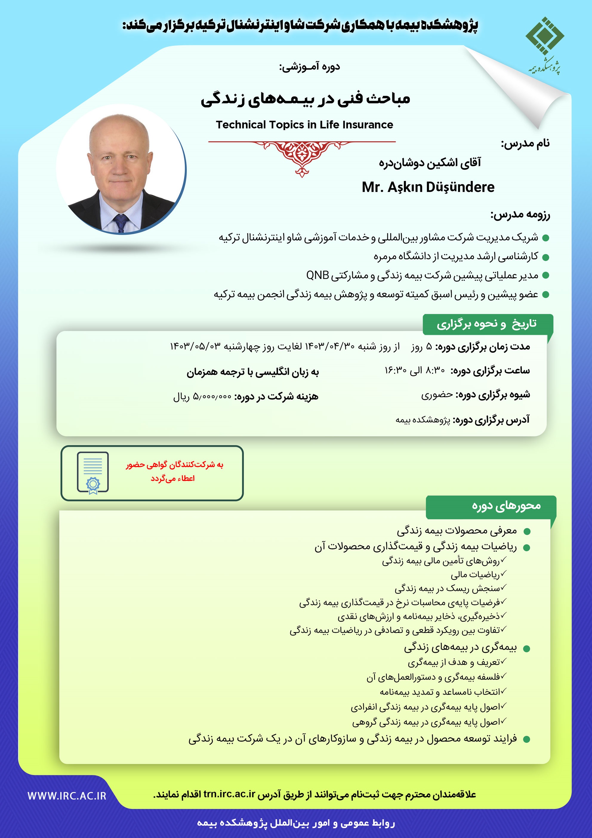 به گزارش روابط عمومی و امور بینالملل پژوهشکده بیمه، در این دوره آموزشی که به صورت حضوری در سالن شهید مطهری پژوهشکده بیمه برگزار میگردد، محورهای «معرفی محصولات بیمه زندگی»، «ریاضیات بیمه زندگی و قیمت گذاری محصولات آن؛ شامل زیرمحورهای روشهای تأمین مالی بیمه زندگی؛ ریاضیات مالی؛ سنجش ریسک در بیمه زندگی؛ فرضیات پایه محاسبات نرخ در قیمتگذاری بیمه زندگی؛ ذخیرهگیری ذخایر بیمهنامه و ارزشهای نقدی؛ تفاوت بین رویکرد قطعی و تصادفی در ریاضیات بیمه زندگی»، «بیمهگری در بیمههای زندگی؛ شامل زیرمحورهای تعریف و هدف از بیمهگری؛ فلسفه بیمهگری و دستورالعملهای آن؛ انتخاب نامساعد و تمدید بیمهنامه؛ اصول پایه بیمهگری در بیمه زندگی انفرادی؛ اصول پایه بیمه گری در بیمه زندگی گروهی» و «فرایند توسعه محصول در بیمه زندگی و سازوکارهای آن در یک شرکت بیمه زندگی» توسط آقای اشکین دوشاندره شریک مدیریت شرکت مشاور بینالمللی و خدمات آموزشی شاو اینترنشنال ترکیه ارائه خواهد شد.