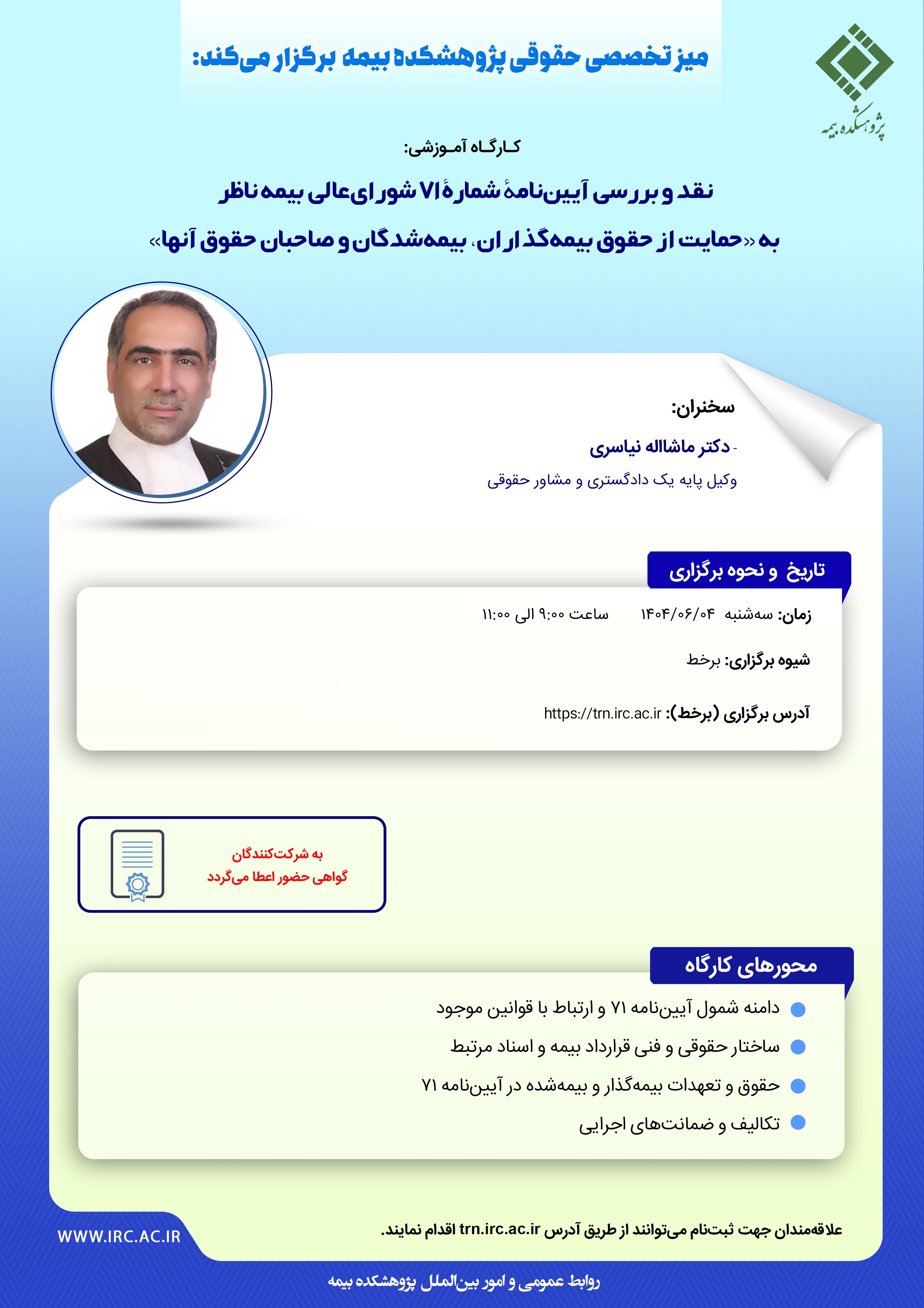 به گزارش روابط عمومی و امور بینالملل پژوهشکده بیمه، در این کارگاه آموزشی محورهای «دامنه شمول آییننامه ۷۱ و ارتباط با قوانین موجود»، «ساختار حقوقی و فنی قرارداد بیمه و اسناد مرتبط»، «حقوق و تعهدات بیمهگذار و بیمهشده در آییننامه ۷۱»، «تکالیف و ضمانتهای اجرایی» توسط آقای دکتر ماشااله نیاسری، وکیل پایه یک دادگستری و مشاور حقوقی ارائه خواهد شد.
