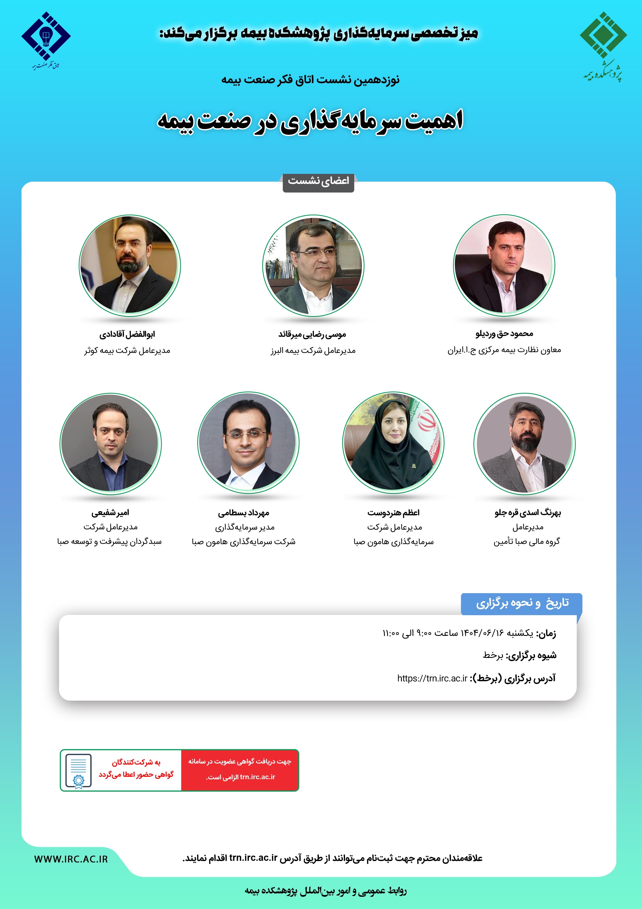 حضور در این نشست برای عموم آزاد و مستلزم ثبتنام از طریق سامانه مدیریت یادگیری پژوهشکده بیمه به نشانی https://trn.irc.ac.ir میباشد. پس از ثبتنام، ورود به نشست از طریق همین نشانی امکانپذیر خواهد بود و به کلیه شرکت کنندگان نیز گواهی حضور اعطا میگردد.