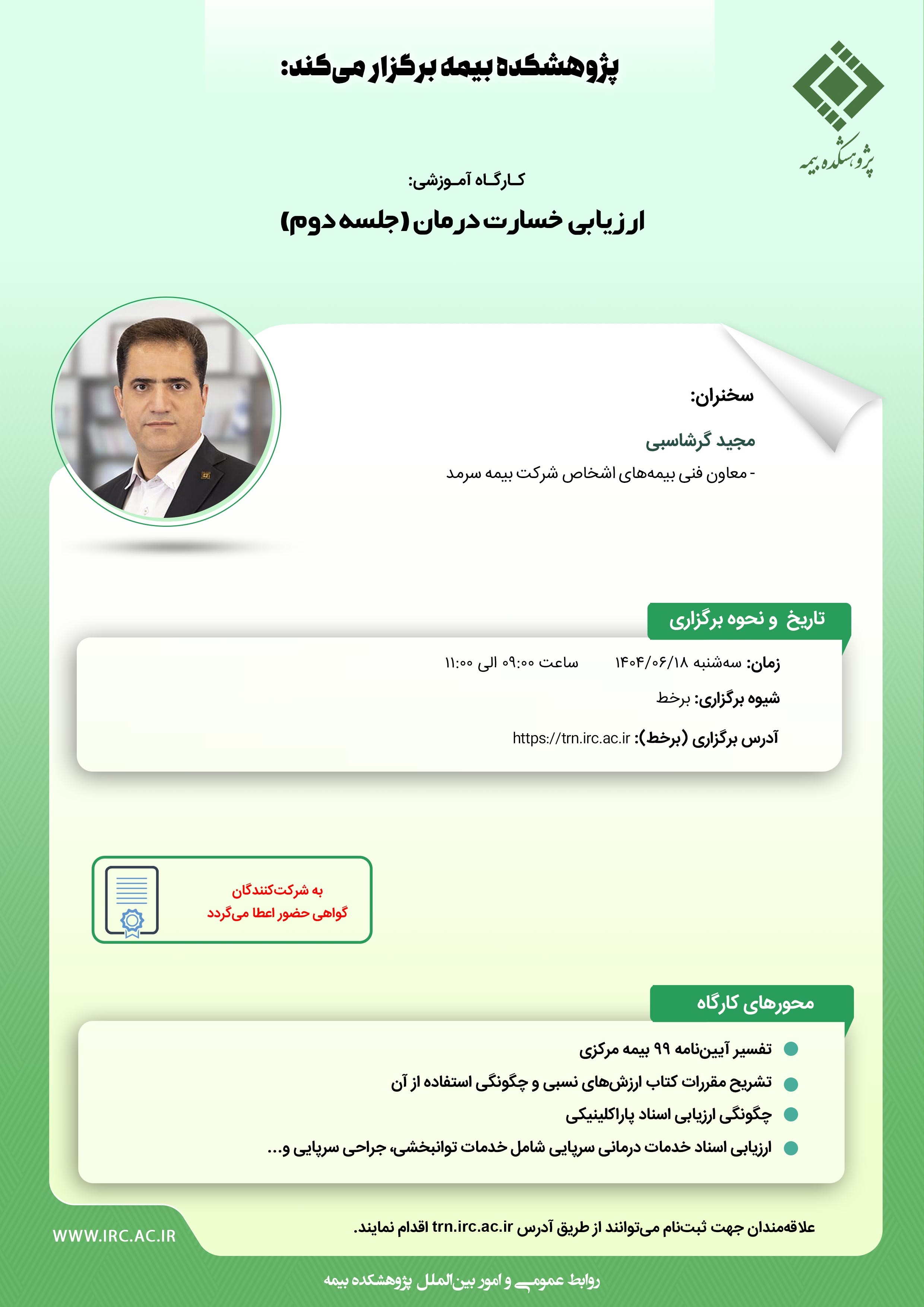 حضور در این رویداد علمی برای عموم آزاد و مستلزم ثبتنام از طریق سامانه مدیریت یادگیری پژوهشکده بیمه به نشانی https://trn.irc.ac.ir میباشد. پس از ثبتنام، ورود به کارگاه از طریق همین نشانی امکانپذیر خواهد بود و به کلیه شرکت کنندگان نیز گواهی حضور اعطا میگردد.
