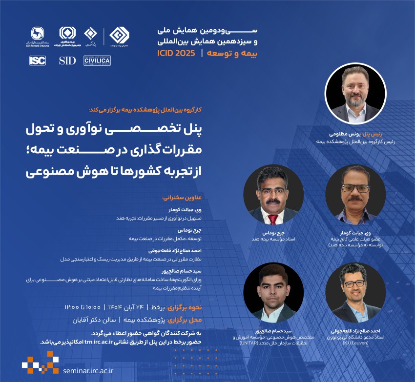 به گزارش روابط عمومی و امور بینالملل پژوهشکده بیمه، پنل تخصصی «نوآوری و تحول مقرراتگذاری در صنعت بیمه؛ از تجربه کشورها تا هوش مصنوعی» از ساعت ۱۰:۰۰ تا ۱۲:۰۰ روز شنبه ۲۴ آبانماه ۱۴۰۴ در سالن دکتر آقایان پژوهشکده بیمه و بهصورت برخط برگزار خواهد شد.