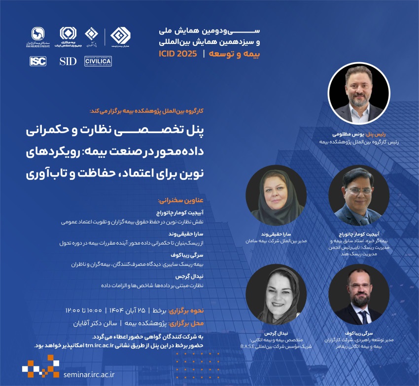 به گزارش روابط عمومی و امور بینالملل پژوهشکده بیمه، پنل تخصصی "نظارت و حکمرانی دادهمحور در صنعت بیمه: رویکردهای نوین برای اعتماد، حفاظت و تابآوری" از ساعت ۱۰:۰۰ تا ۱۲:۰۰ روز یکشنبه 25 آبانماه ۱۴۰۴ در سالن دکتر آقایان پژوهشکده بیمه و بهصورت برخط برگزار خواهد شد. این نشست علمی در چارچوب سیودومین همایش ملی و سیزدهمین همایش بینالمللی بیمه و توسعه، با هدف بررسی تجارب بینالمللی و ظرفیتهای فناورانه در تحول تنظیمگری بیمهای برگزار میشود. ریاست این پنل را یونس مظلومی، رئیس کارگروه بینالملل پژوهشکده بیمه بر عهده دارد و سخنرانان آن عبارتند از: