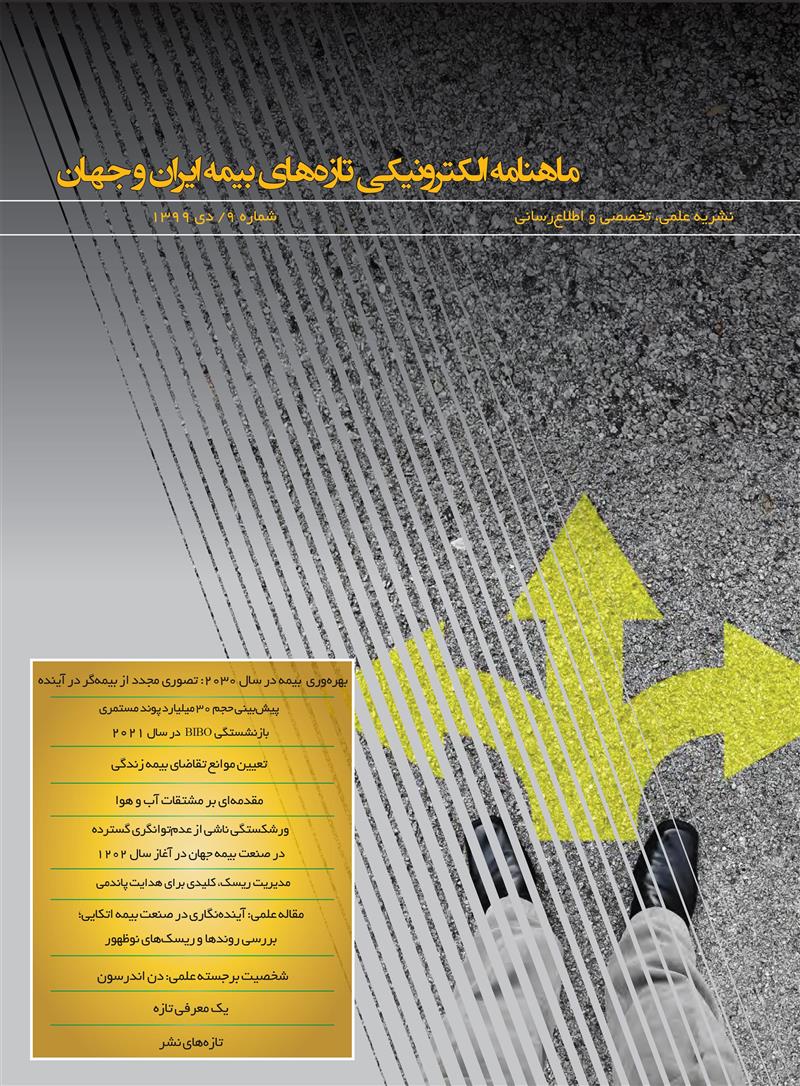 PDF 1399/11/18 تعداد بازدید : 1238 ماهنامه الكترونیكی تازههای بیمه ایران و جهان شماره 9 پژوهشکده بیمه دی 1399 فهرست مطالب پیشگفتار 1- بهرهوری بیمه در سال 2030: تصوری مجدد از بیمهگر آینده 2- پیشبینی حجم 30 میلیارد پوند مستمری بازنشستگی BIBO در سال 2021 3- تعیین موانع تقاضای بیمه زندگی 4- مقدمهای بر مشتقات آب و هوا 5- ورشکستگی ناشی از عدمتوانگری گسترده در صنعت بیمه جهان در آغاز سال 2021 6- مدیریت ریسک، کلیدی برای هدایت پاندمی مقاله علمی شخصیت برجسته علمی تازههای نشر امتیاز :  ۴.۶۷ |  مجموع :  ۶ برچسب ها