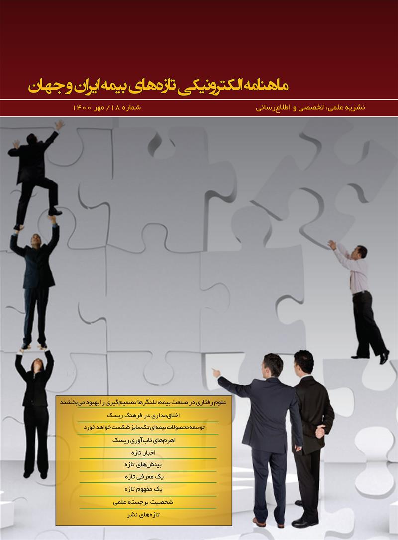 PDF 1400/08/05 تعداد بازدید : 1067 ماهنامه الكترونیكی تازههای بیمه ایران و جهان شماره 18 مهر 1400 فهرست مطالب پیشگفتار مطالب اصلی 1- علوم رفتاری در صنعت بیمه؛ تلنگرها تصمیمگیری را بهبود میبخشند ۲- اخلاقمداری در فرهنگ ریسک ۳- توسعه محصولات بیمهای تکسایز شکست خواهد خورد ۴. اهرمهای تابآوری ریسک اخبار تازه 1- بیمه در جهان: برگشت به شرایط عادی، سرعت میگیرد 2- بازار کشف تقلبهای بیمهای: میزان رشد، روندها، تأثیر کووید-19 و پیشبینیها (2026-2021) 3- فنلاند در صدر رتبهبندی بهترین نظام مستمری بازنشستگی در جهان بینشهای تازه 1- سرمایه گذاری خصوصی در بیمههای زندگی: ریسکها و فرصتهای پیش رو ۲- چگونه صنعت بیمه می تواند باعث از بین رفتن «شکافهای حفاظتی» شود؟ 3- فنآوری و بیمه: حوزهها و چالشها یک معرفی تازه انتقال ریسکهای اقلیمی به صندوق تامین مالی خرد یک مفهوم تازه تلهماتیک و بیمه مبتنی بر استفاده شخصیت برجسته علمی پروفسور حسین فرزین تازههای نشر 1- سنجش ریسک و معیارهای توانگری مالی بیمه: سطوح احتمالات ثابت در مدلهای ریسک تجدید 2- مدیریت ریسک شرکتی و مدیریت کمّی ریسک در بیمه زندگی: کتاب مقدماتی اکچوئرال امتیاز :  ۴.۰۰ |  مجموع :  ۵ برچسب ها